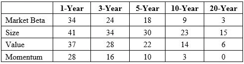 All risky assets and factors can go through very long periods of negative performance. You can see evidence of this in the following table, which covers the period 1927 through 2017. It shows the odds (expressed as a percentage) of a negative premium over a given time frame. Data in the table is from the Fama/French Data Library.