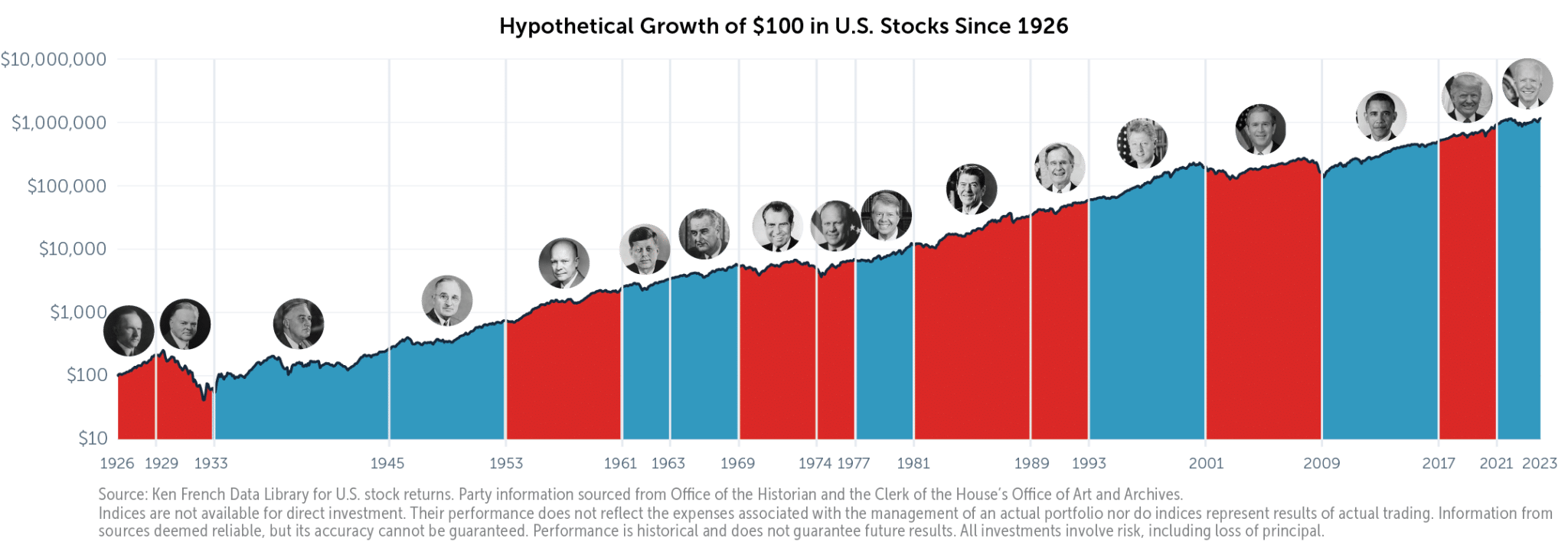 The 2024 presidential election is set to be a repeat of the Biden versus Trump contest of 2020. With both houses of Congress up for grabs, the stakes are high for either party, so it is understandable for the U.S. public to be nervous. Regardless of how the election plays out, political tensions will likely remain elevated throughout the next president’s term, adding to an already contentious global political climate. Against this backdrop, many investors are anxious about the possible impact on financial markets. Here’s what to keep in mind this election season.